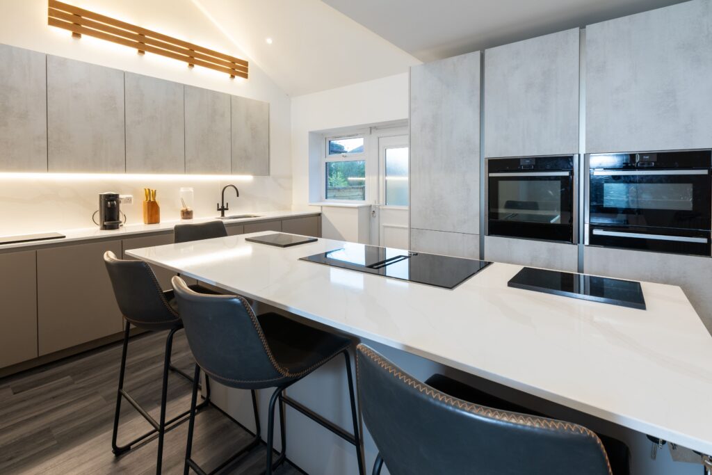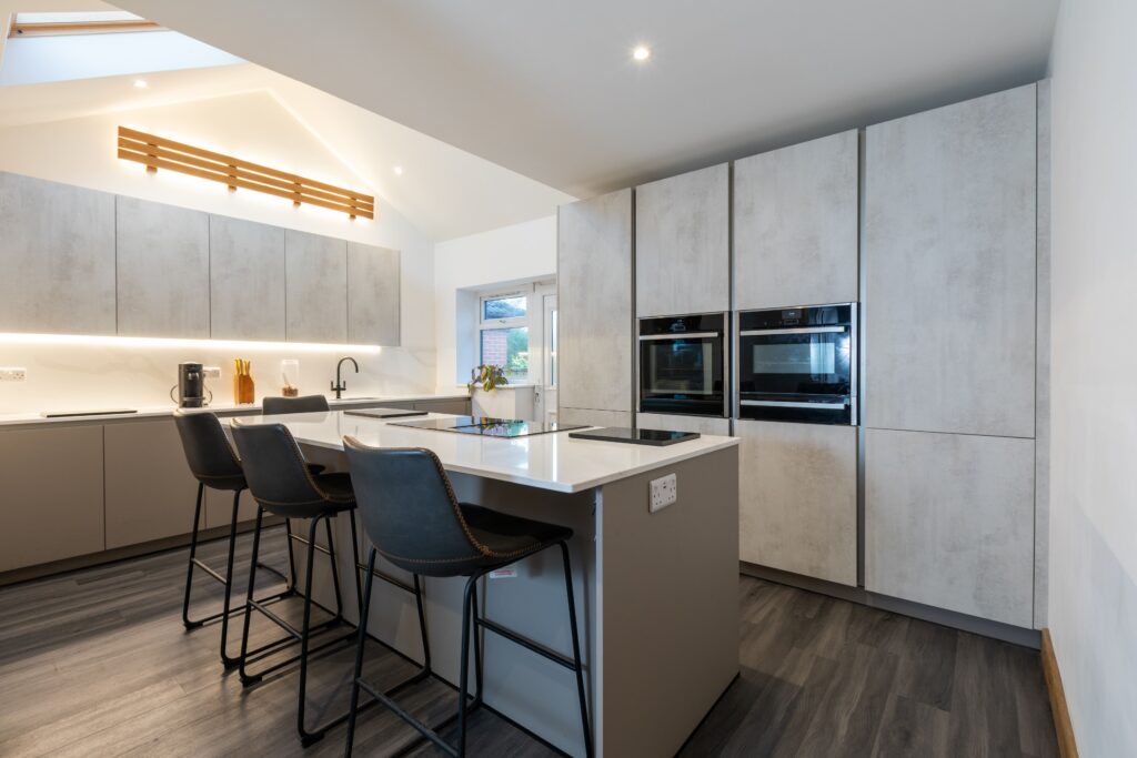 This contemporary handleless kitchen was designed to deliver a sleek, minimalist look while creating a warm and welcoming space for everyday living. Finished in modern grey tones and paired with subtle white quartz worktops, the design feels clean and refined, with a striking island at the centre of the room.