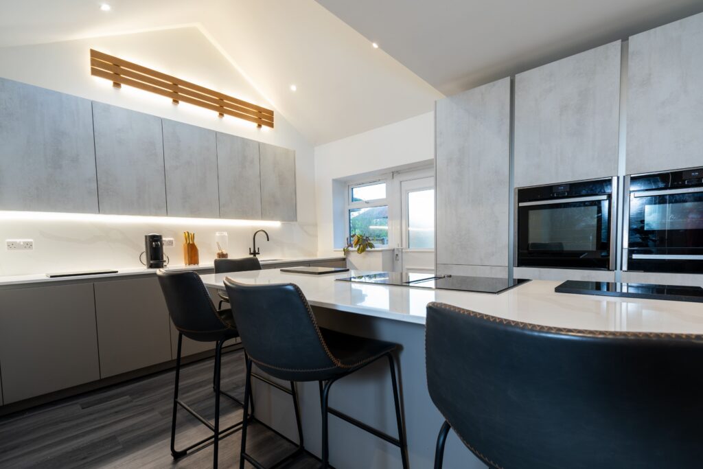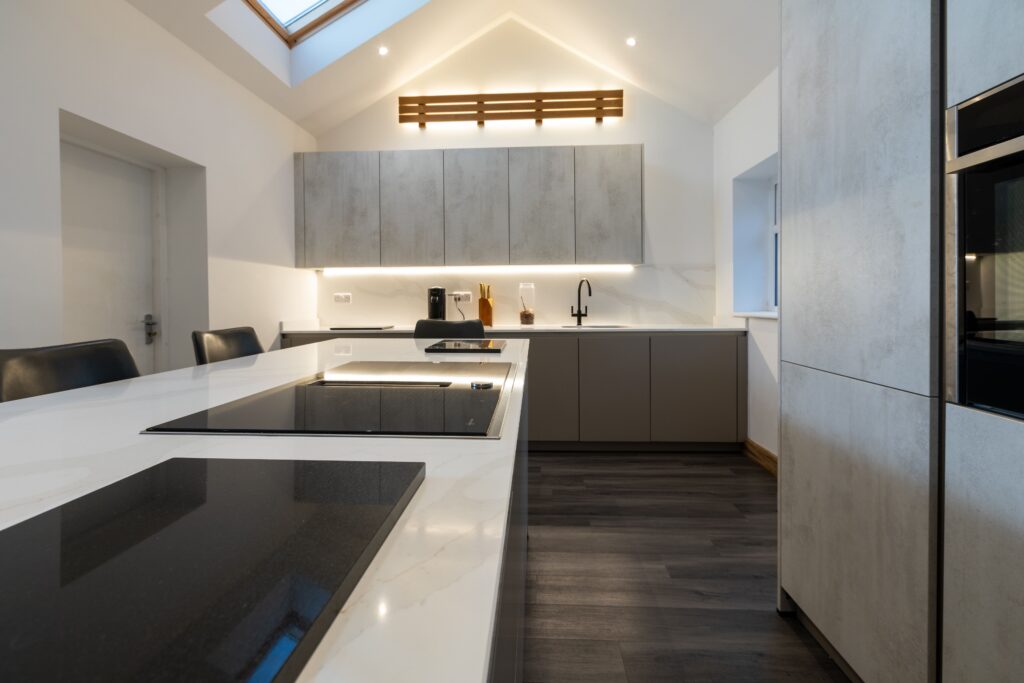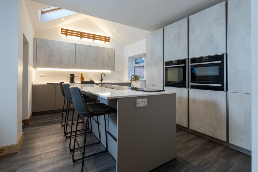 The client wanted a modern kitchen that felt streamlined and clutter-free, while still offering plenty of storage and a sociable layout. Handleless cabinetry in soft grey tones was selected to create a seamless finish, complemented by tall units that neatly house the integrated NEFF appliances. A large island takes centre stage, providing generous preparation space as well as comfortable seating for casual dining. The subtle white quartz worktop helps to brighten the room and ties the full scheme together beautifully. One of the key design features was the vaulted ceiling, which the client wanted to stand out as a real focal point. To enhance this architectural detail, carefully positioned lighting was used to highlight the ceiling lines, while integrated LED lighting beneath the wall units adds a warm glow across the workspace.