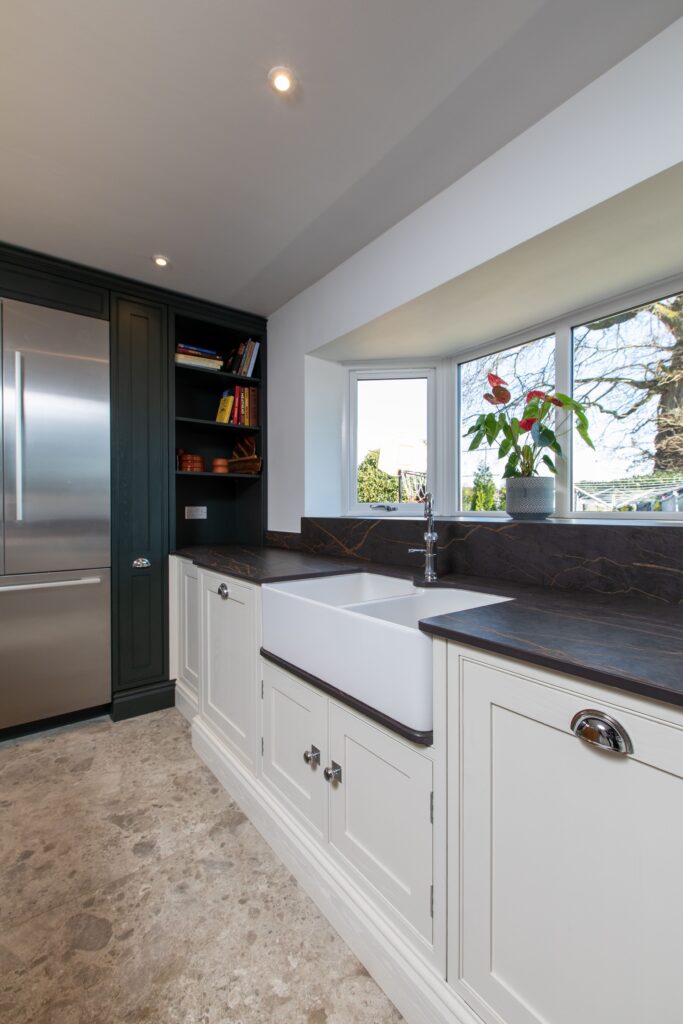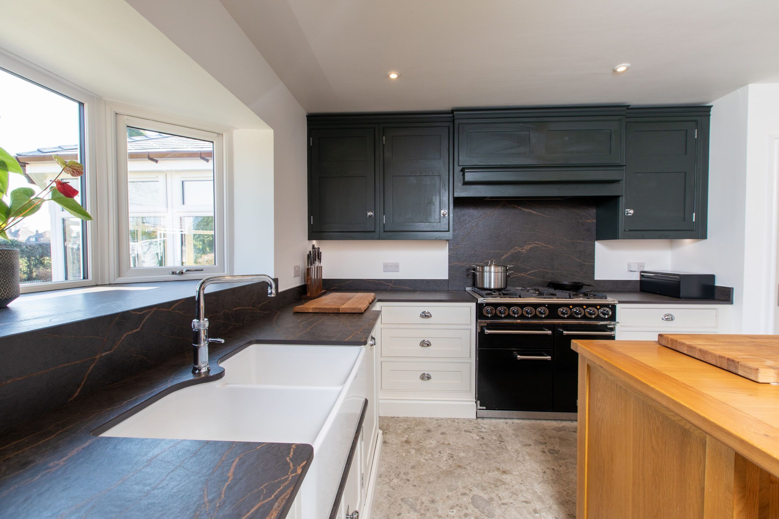 The design centres on traditional shaker cabinets finished in a deep, heritage-inspired tone, contrasted with lighter cabinetry to maintain balance and visual clarity. Stone worktops introduce texture and subtle movement, continuing up the walls as a full-height splashback behind the range cooker to create a strong focal point. A Falcon range cooker anchors the cooking area, reinforcing the kitchen’s traditional character, while a NEFF wine cooler is integrated neatly into the tall cabinetry to add a modern, functional touch. A double ceramic sink is positioned beneath the window to take advantage of natural daylight, paired with a Quooker tap for everyday convenience.