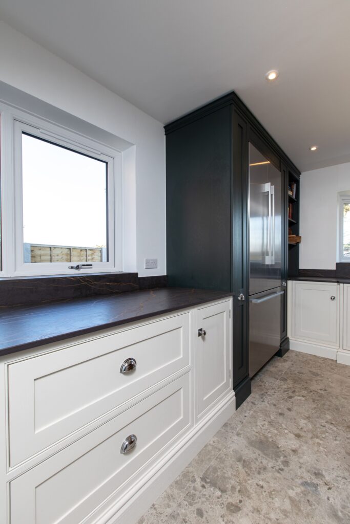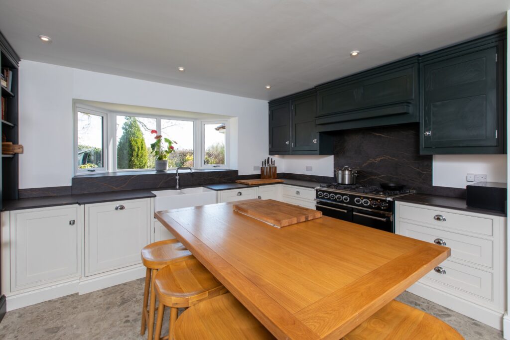 This traditional kitchen balances classic detailing with carefully chosen contemporary elements, resulting in a space that feels grounded, practical and confidently composed. Dark painted cabinetry is paired with lighter base units to create contrast without overpowering the room, allowing the architecture and materials to take the lead.