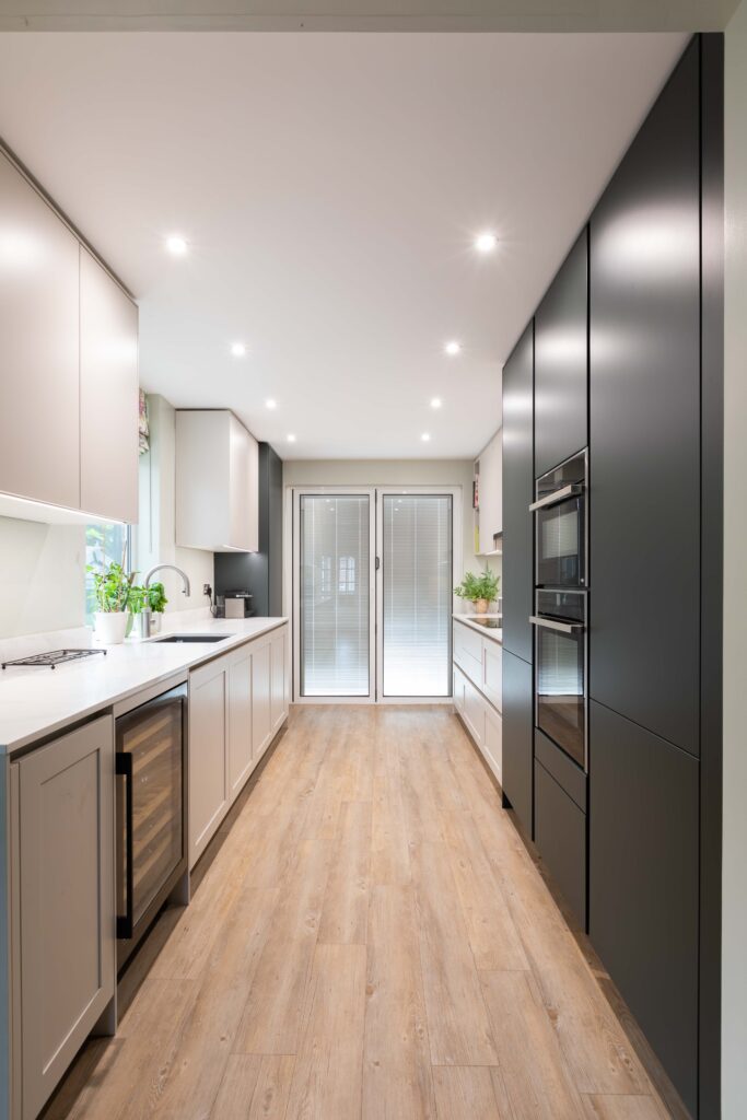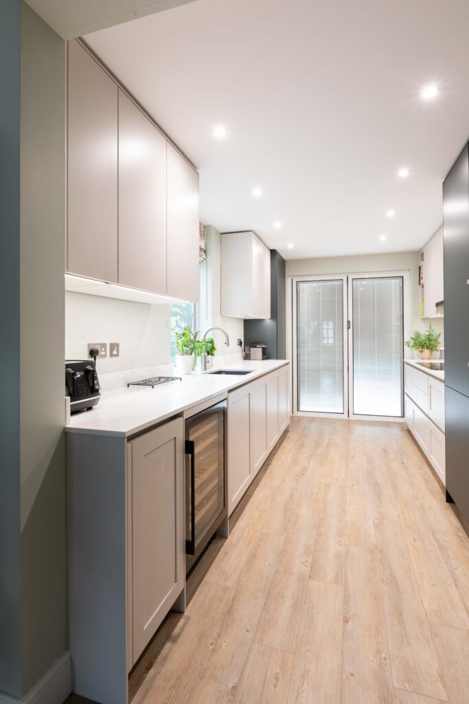 “We designed this luxurious double galley kitchen to provide our client with an abundance of practical storage and preparation space. Olive green was chosen for the bespoke units along the right of the room, providing a striking look and taking the units up to the ceiling reduces the feeling of clutter. Handleless Shaker-style doors in pearl grey complement the darker doors and allow light to reflect around the room, enhanced by specialist lighting. The kitchen is jam-packed with energy-efficient Neff appliances including a Neff slide and hide oven, combi oven, induction hob with telescopic extractor hood and wine cooler. And no modern kitchen is complete without an instant boiling water tap from Quooker.”