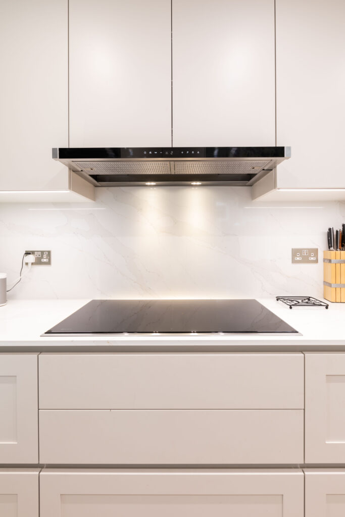 The kitchen is fitted with top-of-the-line, integrated units, including a sleek, black induction hob and advanced extractor hood that has been discreetly integrated. Tall housing units cleverly conceal the state-of-the-art oven and microwave, optimising kitchen operations without cluttering the space.