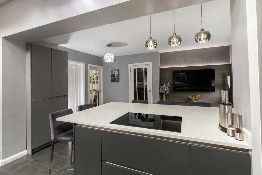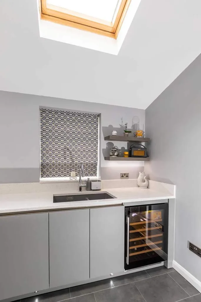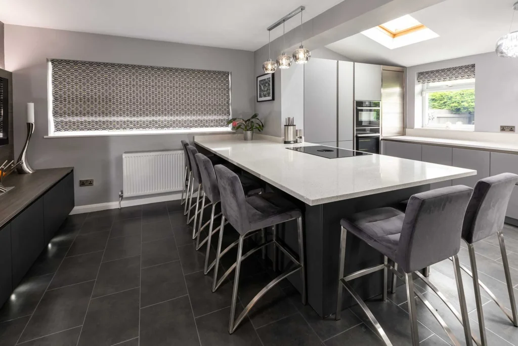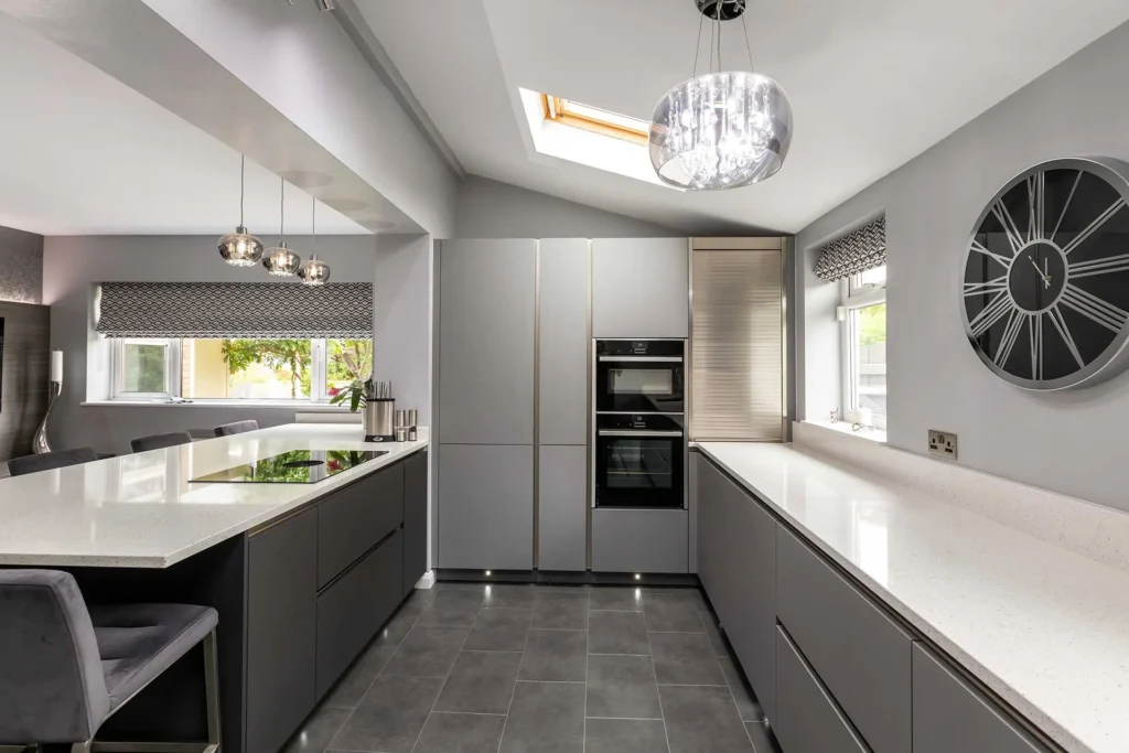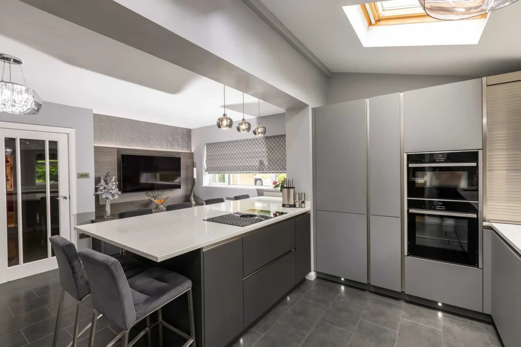 In this kitchen, matte grey cabinetry lends a contemporary sophistication, while the seamless, handleless design contributes to the kitchen's clean and minimalist aesthetic. The subtle grey tones perfectly balance with the high-gloss quartz worktops, which reflect natural illumination from the large skylight overhead.