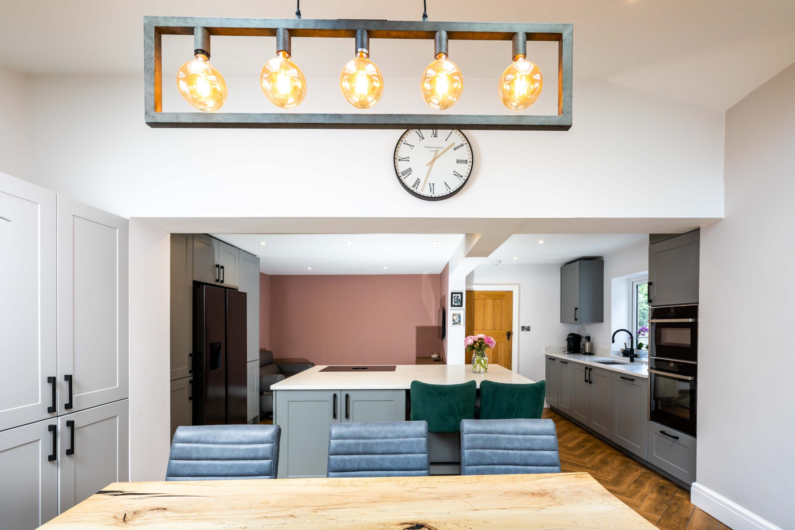 “A new extension deserves a beautiful high-quality kitchen to add value to the home. Graham worked with the builders and designed this stunning Keller kitchen in Titanium and pearl. The couple already had a new American-style fridge freezer, so we designed their new kitchen to make it a great feature. A matching pantry in the dining room was high on the wish list for this family, so Graham designed a bespoke unit tailored to fit both their aesthetic and budget, and the couple were delighted with the result.”