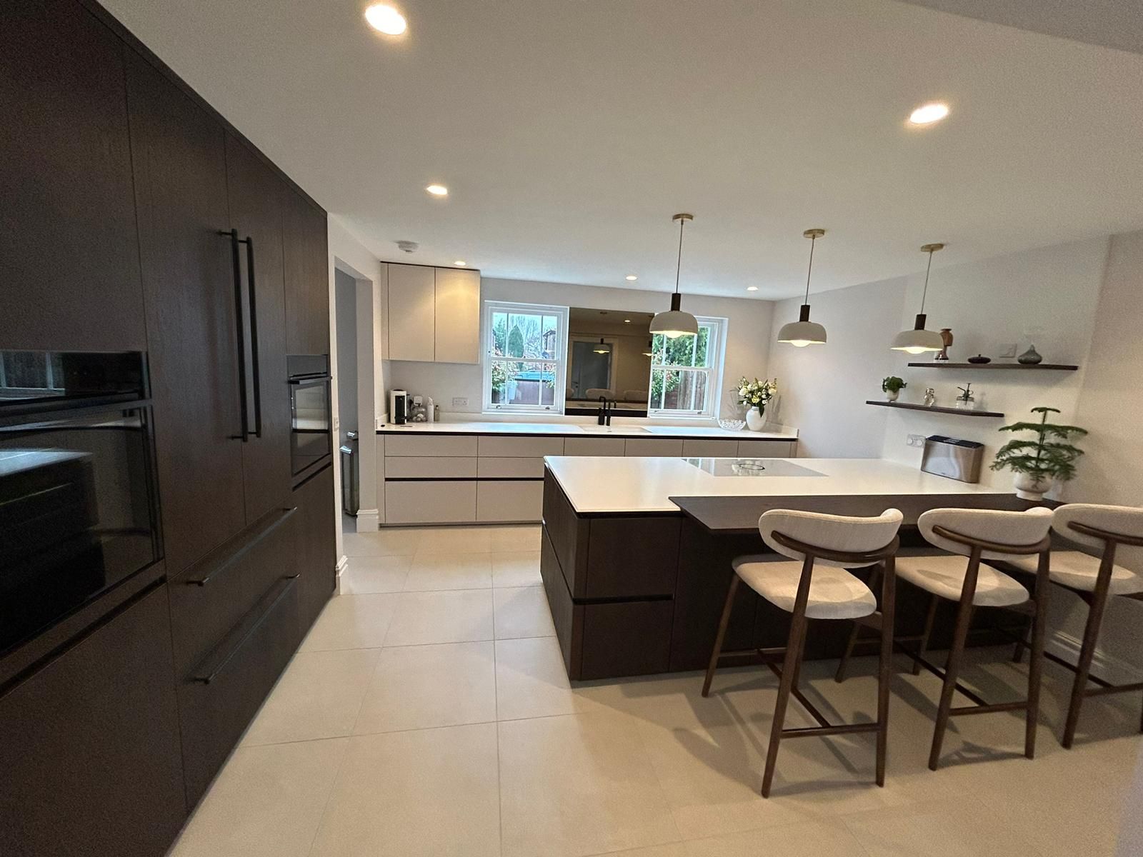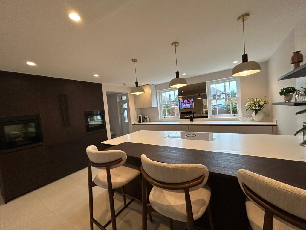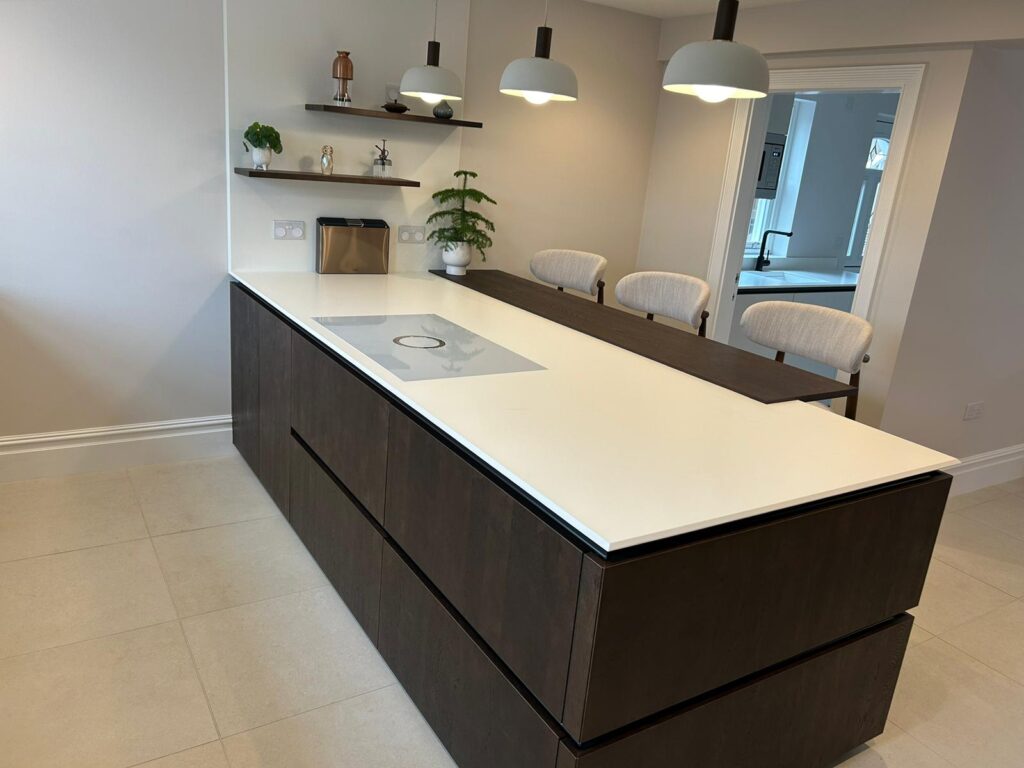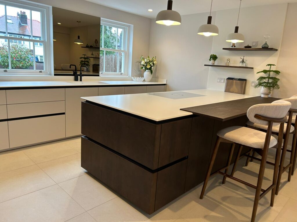 This German kitchen by Schuller has a sleek, modern design with a neutral and minimalistic colour palette. We created a spacious, open layout to maximise the use of space, with a large island in the centre featuring a breakfast bar to offer a comfortable seating area.