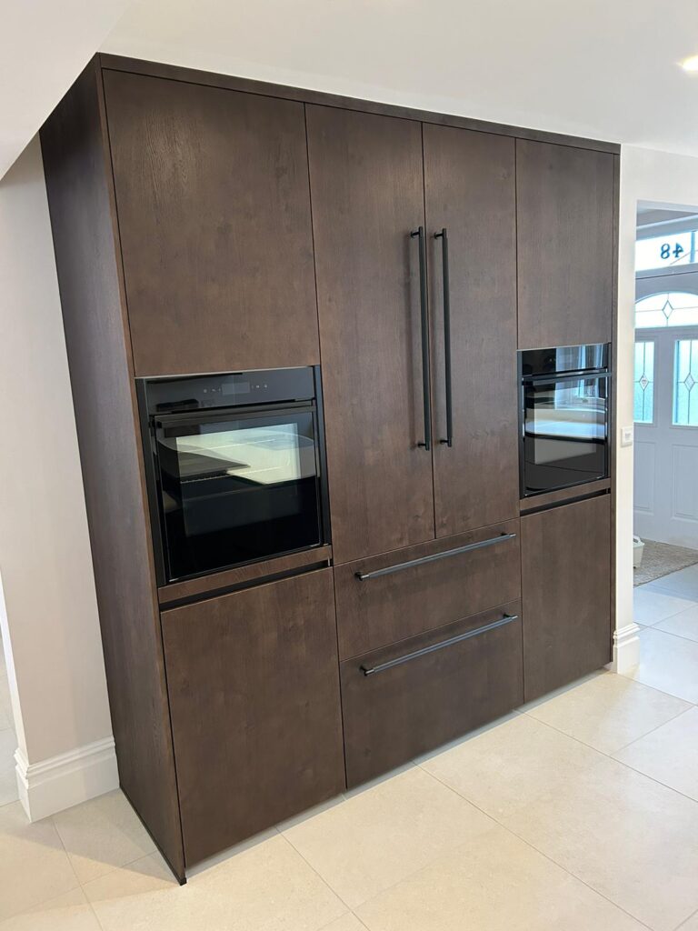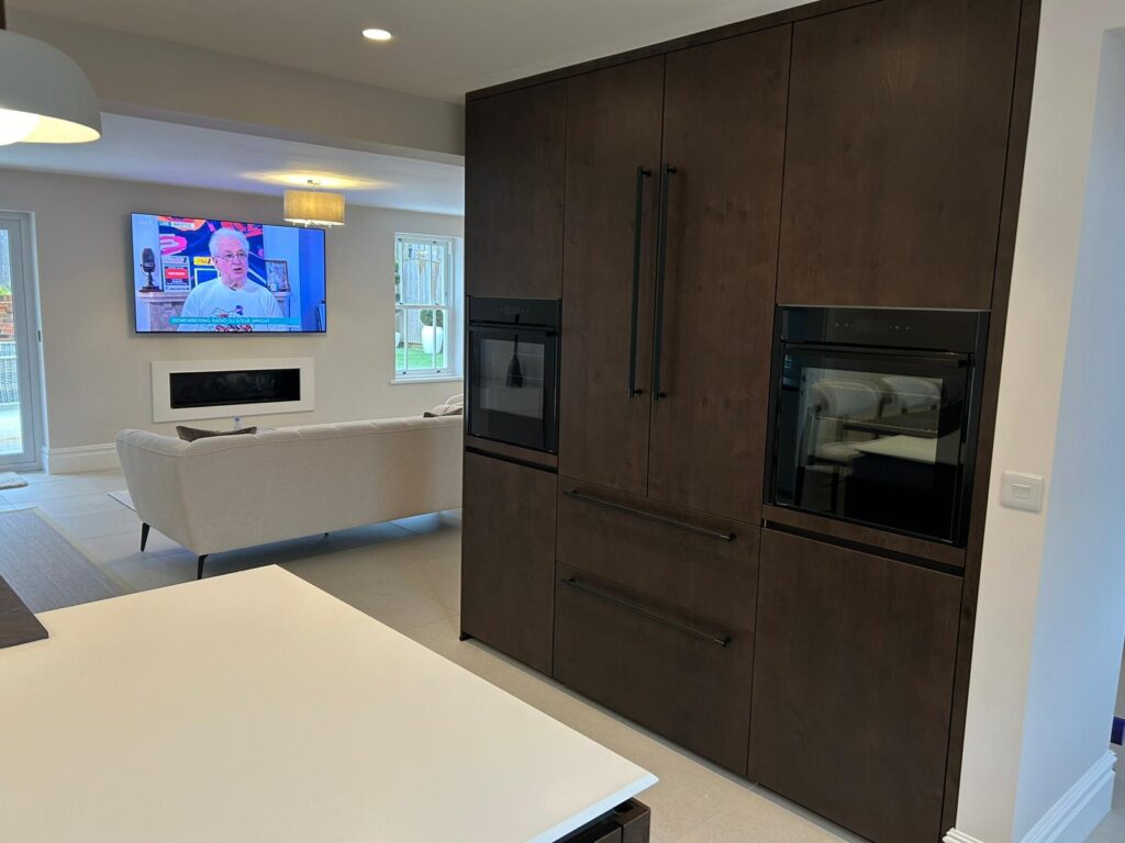 Our customer was keen to avoid a dark induction hob, so we sourced this white hob by Nikola Tesla for its sleek style and great cooking features. A huge Leibber ECBN fridge freezer keeps food fresh for longer via its clever microclimate. Two Neff collection ovens with brushed black handles are poised for all the families roasting and baking needs, while the Quooker cube, in matching black is ready to serve boiling, chilled and fizzy water.